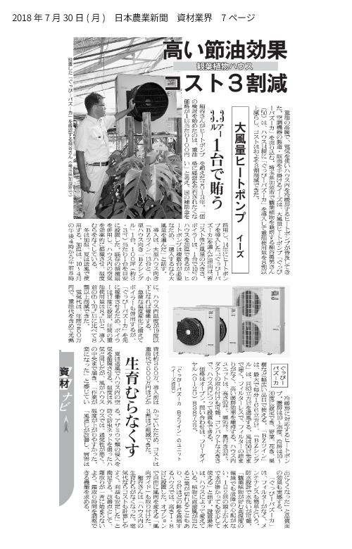 2018年07月30日付「高い節油効果 観葉植物ハウス コスト3割減 大風量ヒートポンプ イーズ」 イーズのヒートポンプ(ぐっぴーバズーカ)活用事例の記事