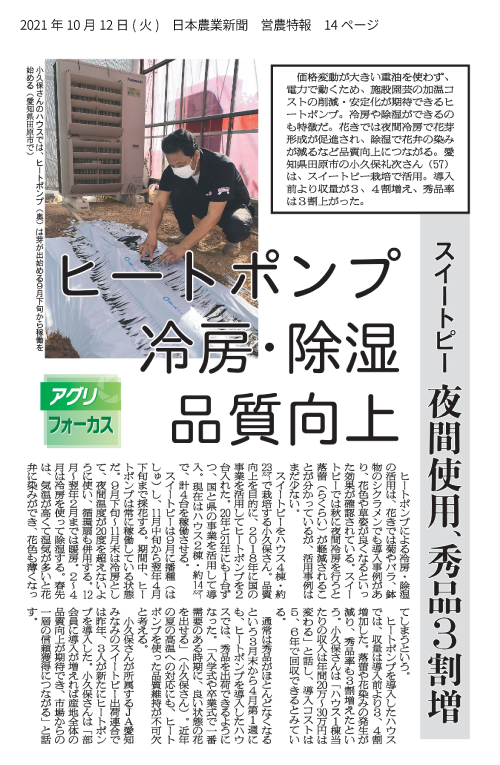 2021年10月21日付「ヒートポンプ冷房・除湿 スイートピー品質向上 」 イーズのヒートポンプ「アグリmoぐっぴー」でスイートピー秀品3割増の記事