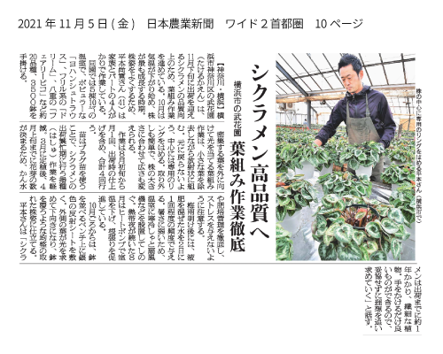 2021年11月05日付「シクラメン高品質へ 横浜市 武花園」 ヒートポンプ(イーズのアグリmoぐっぴー)の活用事例。暑熱対策で根張りを促進の記事