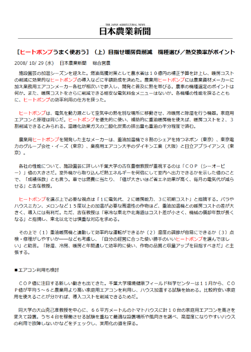 現在ヒートポンプ導入をご検討いただいている方やすでにお使いの皆様に向けて、ここ数年の農業用ヒートポンプに関する記事を、「日本農業新聞」の協力を得て、以下にご紹介します。