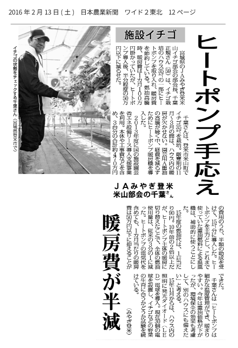 2016年02月13日付「施設イチゴ ヒートポンプ手応え 暖房費が半減」 ヒートポンプ(イーズのぐっぴーバズーカ)導入で暖房費が半減の記事