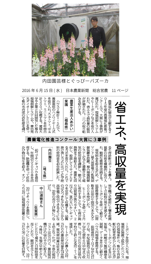 2016年06月15日付「農業電化推進コン大賞事例(キンギョソウ 内田園芸)」 ヒートポンプ(イーズのぐっぴーバズーカ)導入で20%売上増の記事